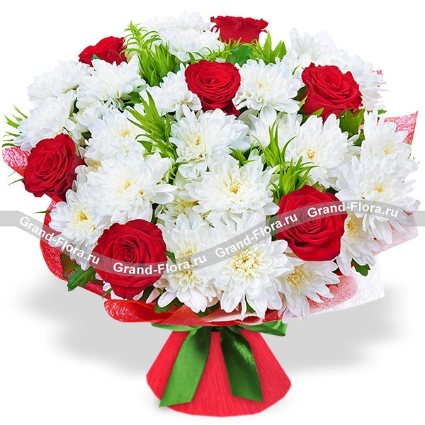 Стандартный: роза красная - 7 шт., хризантема белая - 8 шт., декоративная зелень, упаковка, лента.